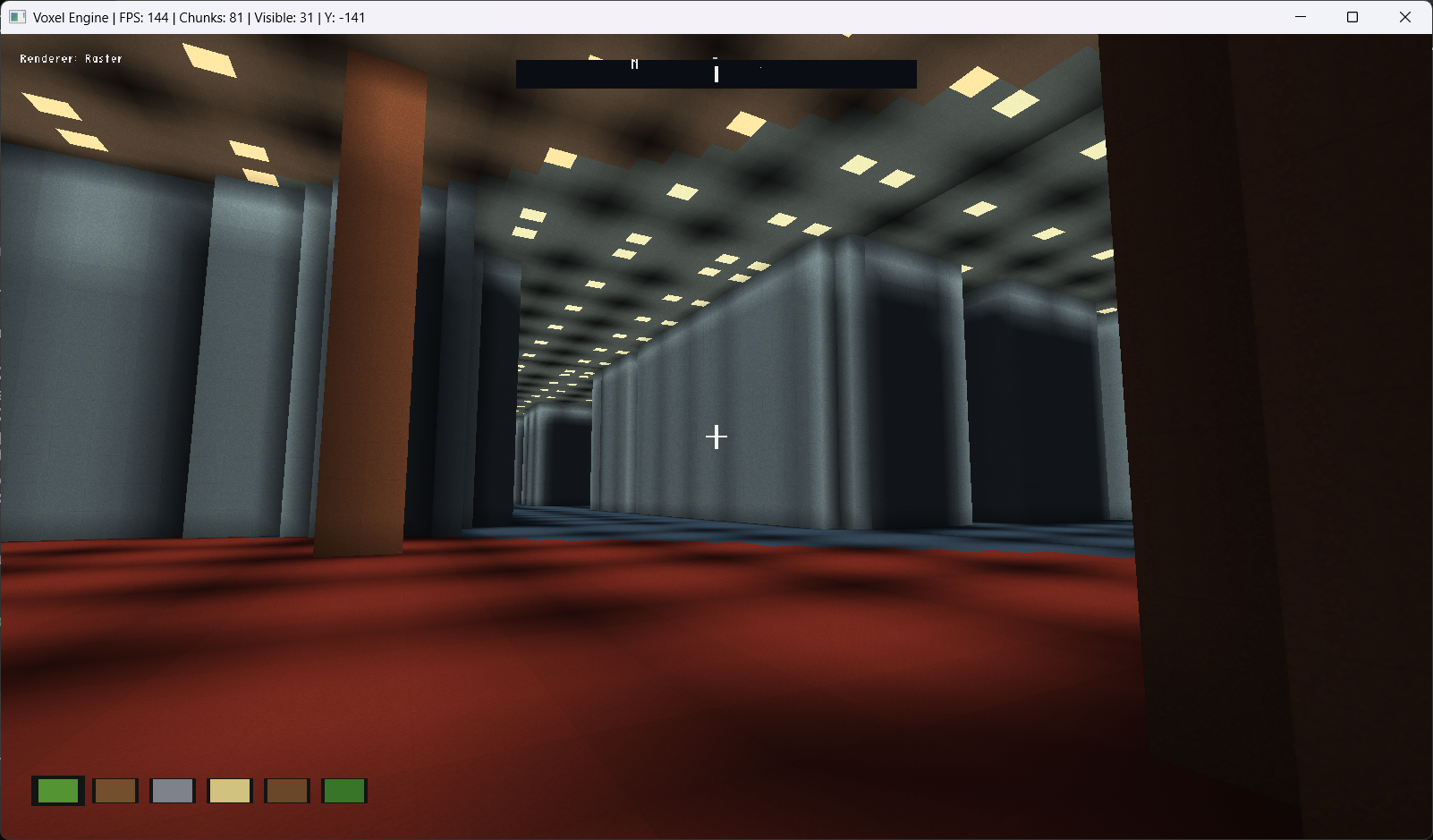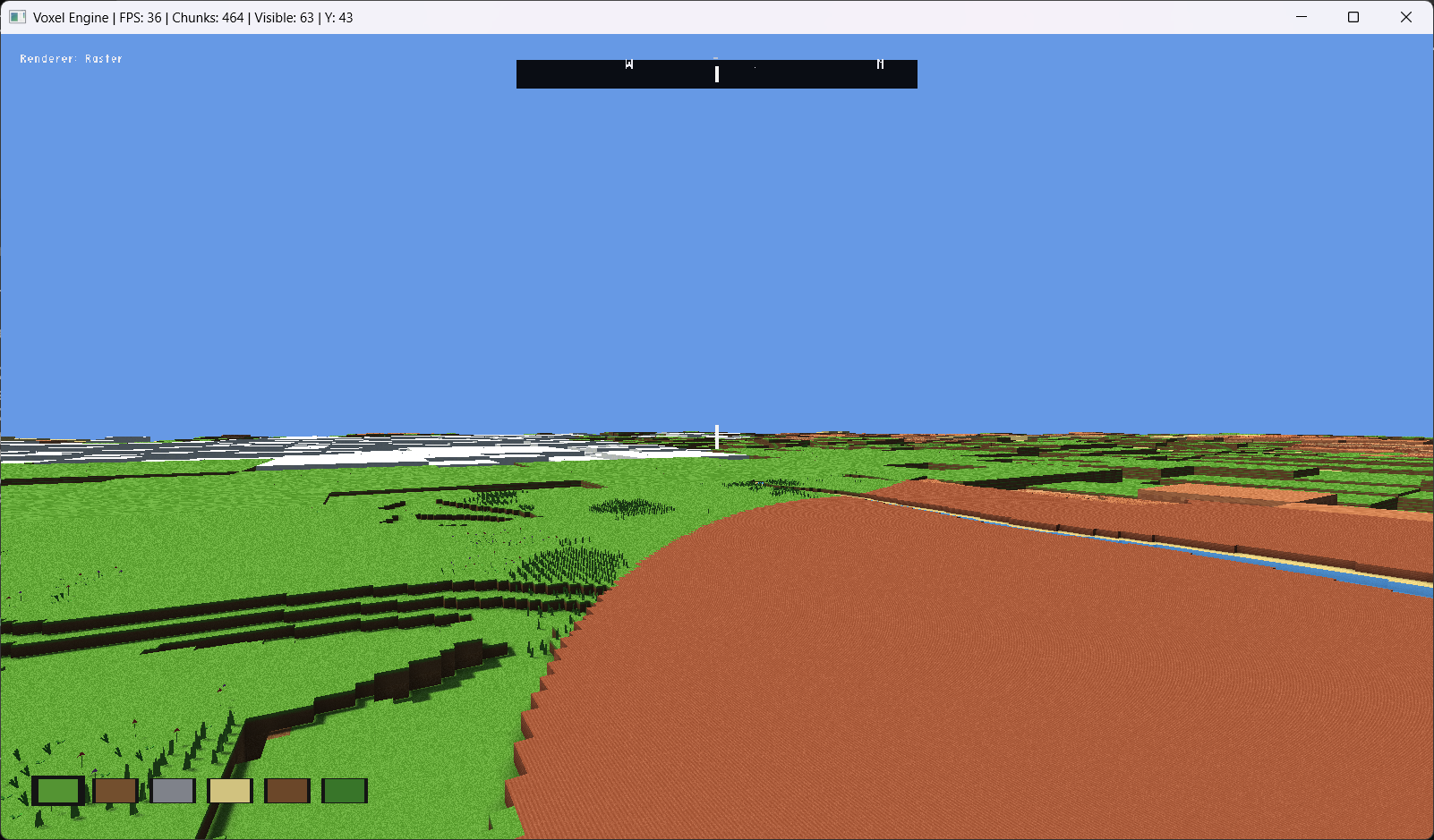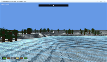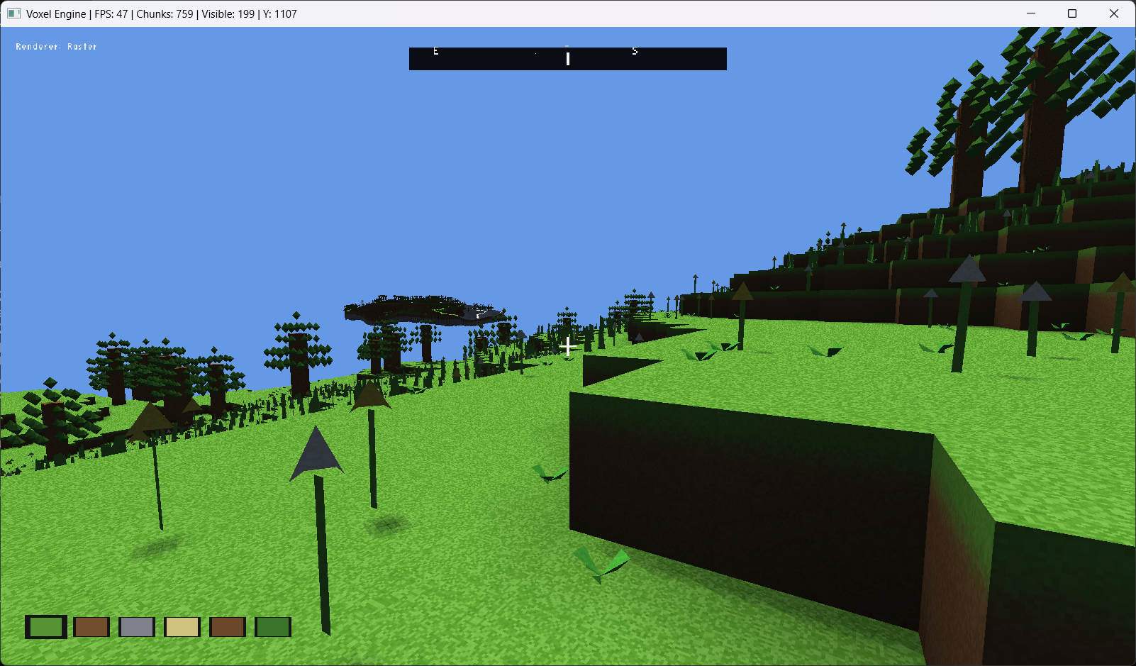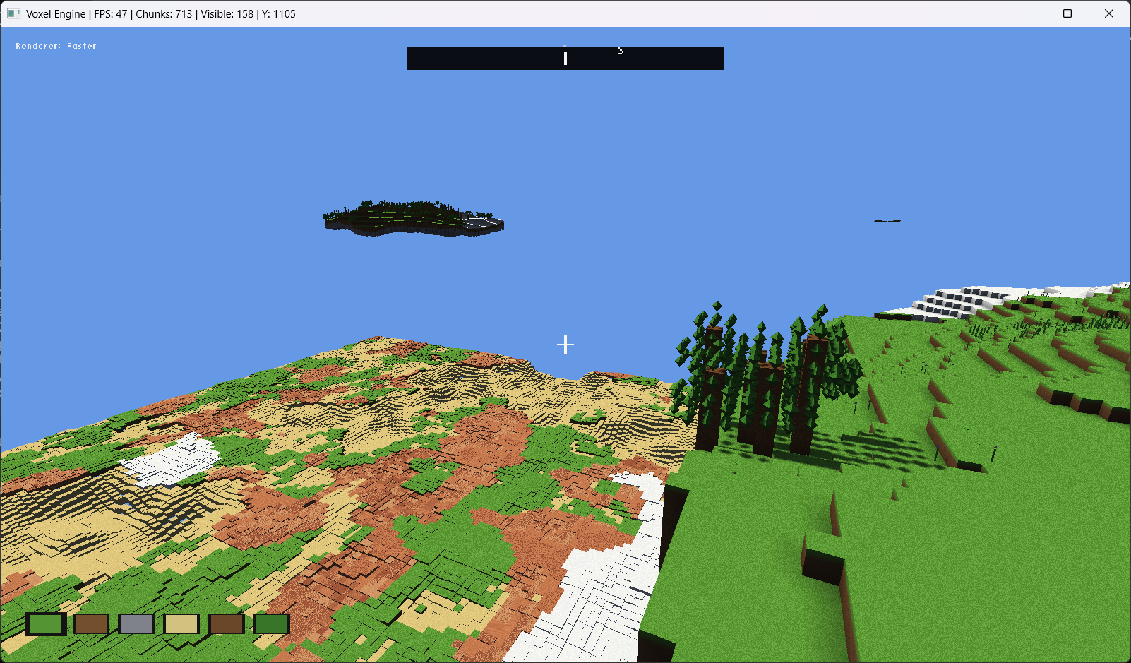 - Voxelception! Chunks are also voxels! Effectively infinite view distance in raster mode! (Distant chunks are rendered as individual voxels, giving a convincing distant horizon.